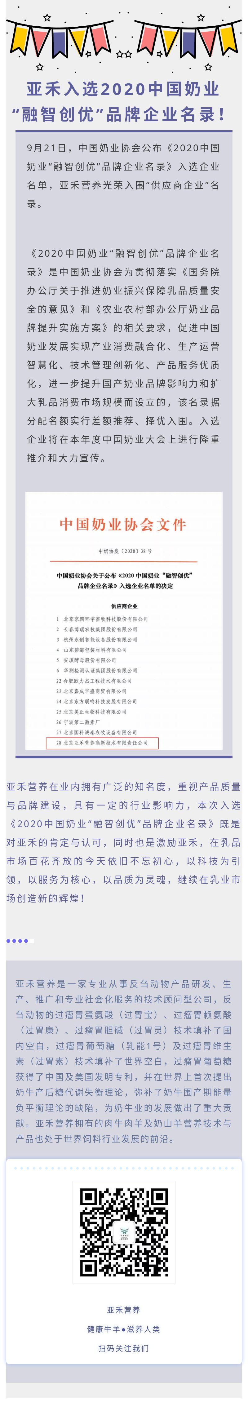 亚禾入选2020中国奶业“融智创优”品牌企业名录!